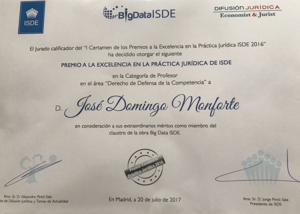 Domingo Monforte Abogados Asociados había sido nominado en un total de 8 categorías, en el I Certamen de Premios a la Excelencia de la Práctica Jurídica de Isde. Administrativo y contencioso administrativo, Trabajo y Seguridad Social, Bancario, Procesal Penal, Defensa de la Competencia, Derecho Civil Sustantivo, Procesal Civil y Responsabilidad Civil.Además de este primer premio, ha quedado finalista en otras dos áreas: Responsabilidad Civil y Derecho Bancario.