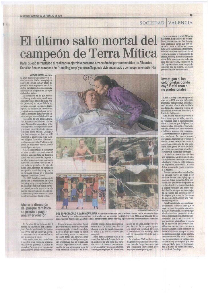 ¿Qué ha pasado en esos trágicos minutos? Rafal tardará meses en poder contarlo. Ese día quiso practicar su doble salto mortal…..y, como tantas veces, se lanzó desde una altura de más de dos metros, hizo el primer giro sin problemas, en el segundo….un instante de oscuridad, la sensación de que algo no va bien, de que necesita ralentizar el movimiento…y de pronto un choque brutal de su cabeza contra el suelo y la oscuridad absoluta.