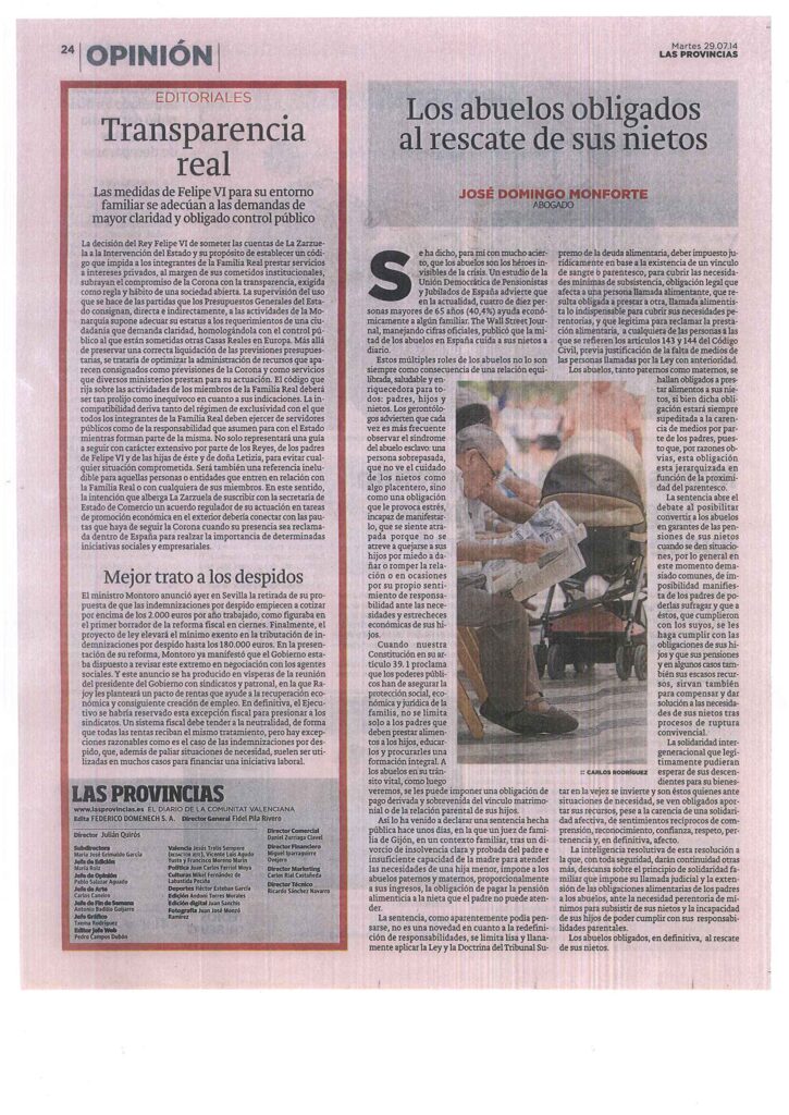 Jose Domingo Monforte. Las Provincias 29-07-2014. Se ha dicho, para mí con mucho acierto, que los abuelos son los héroes invisibles de la crisis. Un estudio de la Unión Democrática de Pensionistas y Jubilados de España advierte que en la actualidad, cuatro de diez personas mayores de 65 años (40’4%) ayuda económicamente a algún familiar. The Wall Street Journal, manejando cifras oficiales, publicó que la mitad de los abuelos en España cuida a sus nietos a diario.