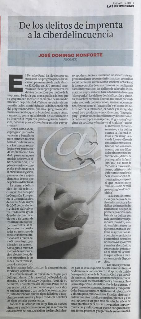 De los delitos de imprenta a la ciberdelincuencia. Un artículo de José Domingo Monforte. Socio director de Domingo Monforte Abogados Asociados.
