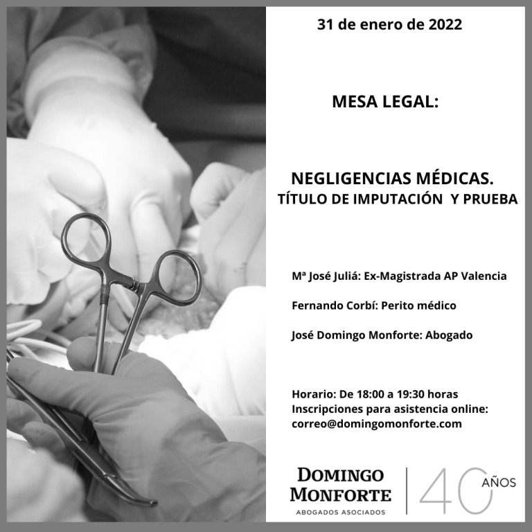 Nuestro director, José Domingo Monforte, experto en Responsabilidad Civil, analizará junto a una exmagistrada de la Audiencia Provincial de Valencia (Dª Mª José Julià) y un médico perito especialista en este tipo de negligencias (Dr. D. Fernando Corbí), cómo debe abordarse un procedimiento de este tipo y las claves para el éxito de la reclamación.