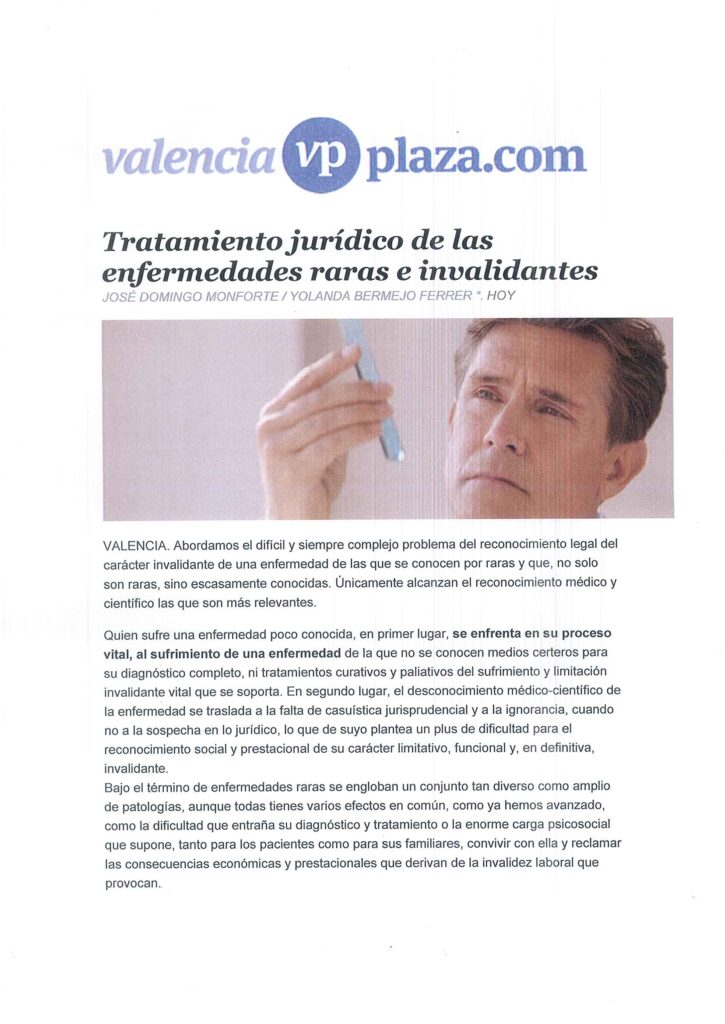 José Domingo Monforte y Yolanda Bermejo Ferrer. Valencia Plaza. Abordamos el difícil y siempre complejo problema del reconocimiento legal del carácter invalidante de una enfermedad de las que se conocen por raras y que, no solo son raras, sino escasamente conocidas. Únicamente alcanzan el reconocimiento médico y científico las que son más relevantes.